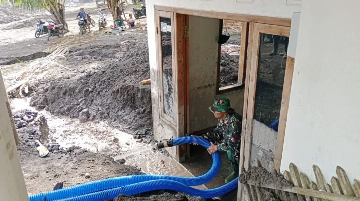 Lumajang — Babinsa Pagowan Koramil 0821-17/Pasrujambe, Serda Samsul Husen bersama anggota lainnya, melaksanakan pembersihan rumah warga yang terdampak lahar dingin dengan metode penggelontoran menggunakan