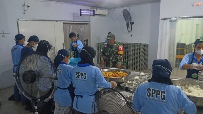 Monitoring ini dilakukan untuk memastikan bahwa seluruh tahapan pengolahan makanan—mulai dari persiapan bahan, proses memasak, hingga pengemasan—memenuhi standar kebersihan dan keamanan pangan. Petugas SPPG tampak bekerja dengan perlengkapan higienis lengkap, sementara Sertu Sutriyadi mengamati setiap alur kerja di dalam dapur.