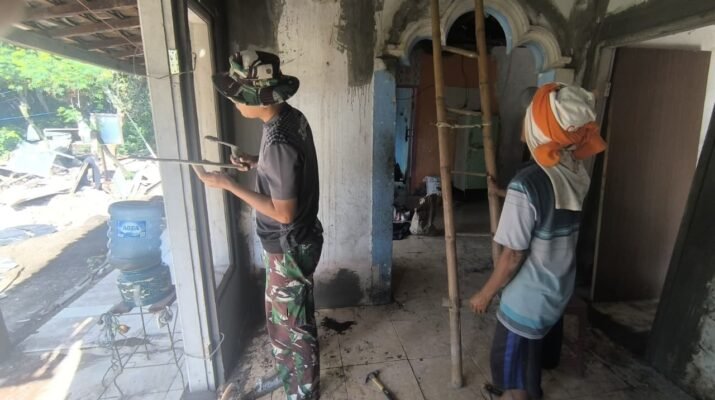 Di lokasi, prajurit dan warga terus bekerja bersama, ada yang memeriksa plesteran dan ada yang mengaduk semen. Suasana gotong royong tetap terasa meski cuaca cukup panas.